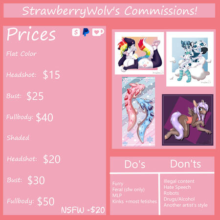 The final product may be used for commercial use, so long as proper credit is given and you tell me before payment.Credit is required when posting artwork on social media (Made by StrawberryWolv is acceptable credit)You are allowed to make small edits to the work, but do not change it to the point it is unrecognizable as my work.You are NOT allowed to edit my work into something that is used to promote political, hateful, racist, or illegal content.Do NOT claim the artwork as yours, including adopts or custom designs.
